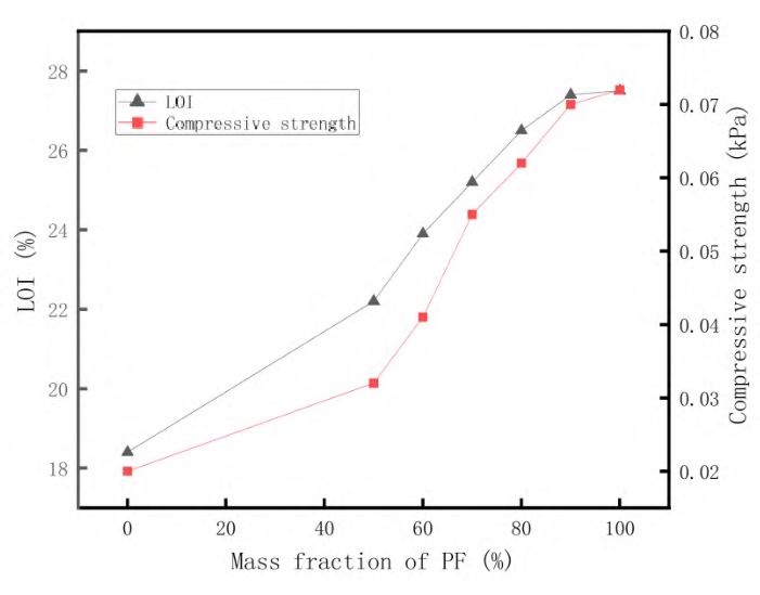 由圖2可知,PF的添加量由0wt%增加至100wt%時(shí),EPS/PF復(fù)合材料的抗壓強(qiáng)度增大。隨著PF添加量的增多,EPS/PF復(fù)合材料極限氧指數(shù)增大,阻燃性能得到提高。當(dāng)PF的添加量由0wt%增加至90wt%時(shí),阻燃性能增長(zhǎng)迅速;當(dāng)PF的添加量由90wt%增加至100wt%時(shí),阻燃性能增長(zhǎng)緩慢。因此,確定PF的添加量為90wt%,EPS/PF復(fù)合材料的阻燃性能及力學(xué)性能相對(duì)較好。數(shù)據(jù)表明,用PF包覆在EPS顆粒外層,能提高材料的阻燃性能。這是因?yàn)樵诟邷叵?,EPS顆粒表面的PF交聯(lián)固化,形成高碳泡沫結(jié)構(gòu),成為***的熱絕緣體,從而提高材料的阻燃性能,同時(shí)降低EPS材料燃燒放出的有毒氣體。